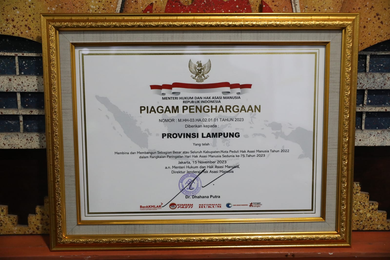 Provinsi Lampung melalui Gubernur Arinal juga mendapat piagam penghargaan sebagai pembina Kabupaten/Kota Peduli HAM Tahun 2022.