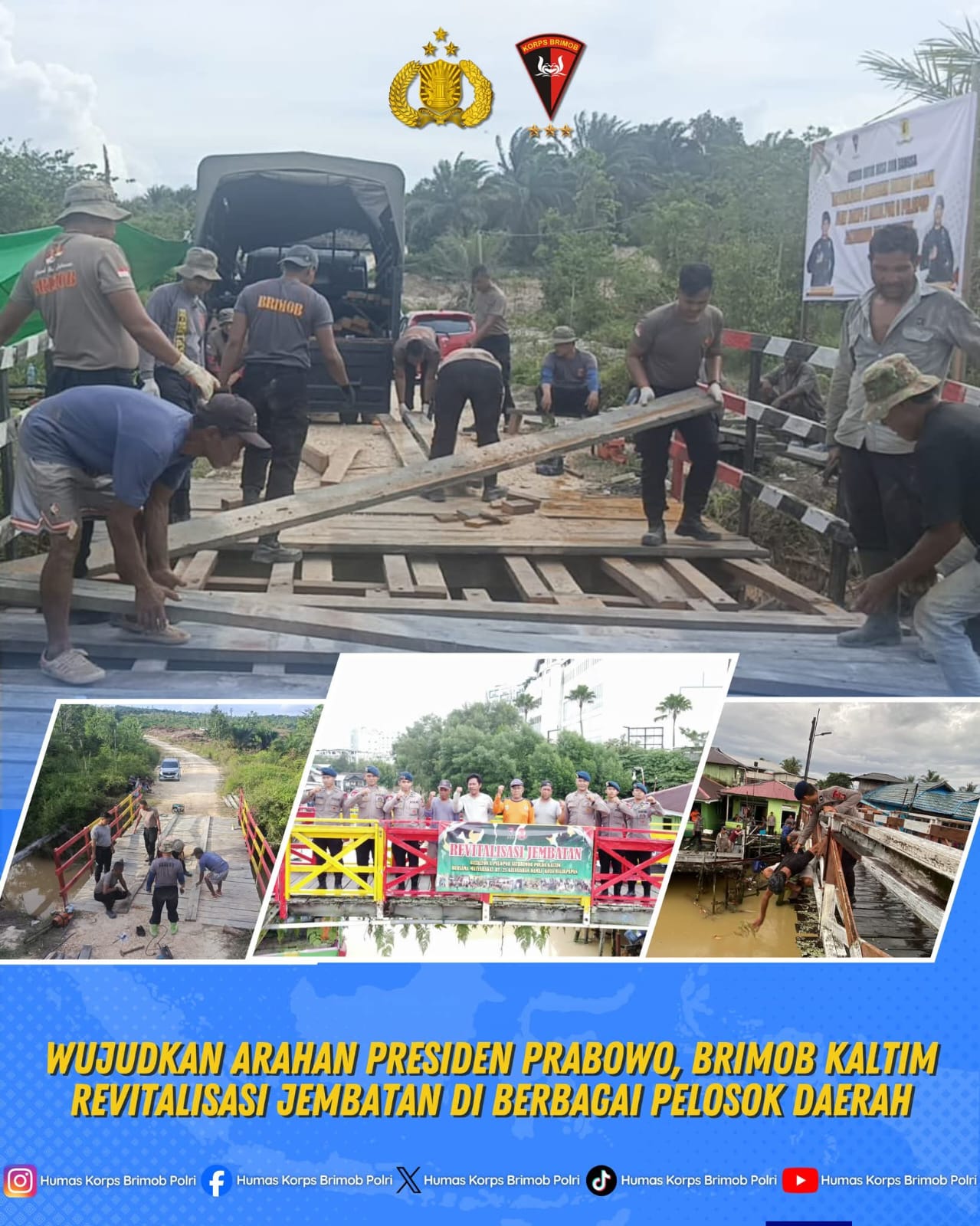 Di Kalimantan Timur, upaya sederhana namun bermakna sedang berlangsung. Satuan Brimob Polda Kaltim turun langsung memperbaiki jembatan-jembatan yang rusak di berbagai wilayah terpencil. Langkah ini menjadi bagian dari upaya mendukung percepatan pembangunan infrastruktur sebagaimana diarahkan oleh Prabowo Subianto.