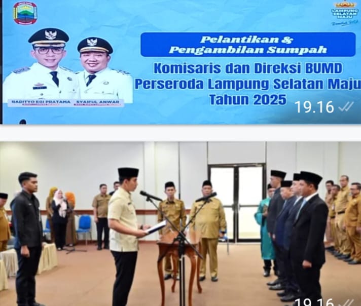 Difatv.com,Kalianda – Bupati Lampung Selatan, Radityo Egi Pratama, S.T., MBA., melantik Komisaris dan Direksi Perusahaan Perseroan Daerah ( Perseroda) Badan Usaha Milik Daerah (BUMD) PT. Lampung Selatan Maju Tahun 2025 yang digelar di Aula Rajabasa Kantor Bupati Lampung Selatan, Selasa ( 9/12/2025 ).