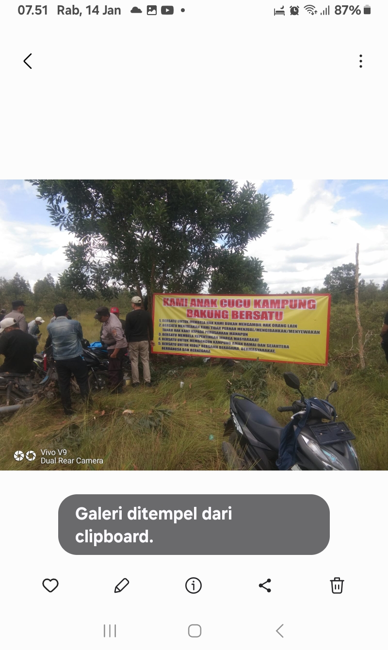 Warga menduduki lahan yang mereka klaim sebagai tanah adat Kampung Bakung, sebagai bentuk protes atas konflik agraria yang telah berlangsung puluhan tahun tanpa penyelesaian hukum yang adil.